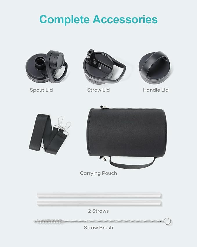 - Super Deal Combo: Buy 64oz insulated water bottle, get 7 accessories. The pack includes 1 x carrying pouch, 3 x lids, 2 x straws, and 1 x straw cleaner. This bottle is ideal for camping, hiking, cycling, running, gym sessions, or outdoor work, ensuring you stay hydrated wherever you go.
