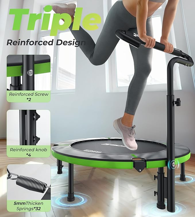 - Ultra-Stable System: Equipped with 2024 upgraded triple reinforced stability system and heavy-duty construction, Our mini trampoline let you say goodbye to the troubles of tipping over and wobbly handle
