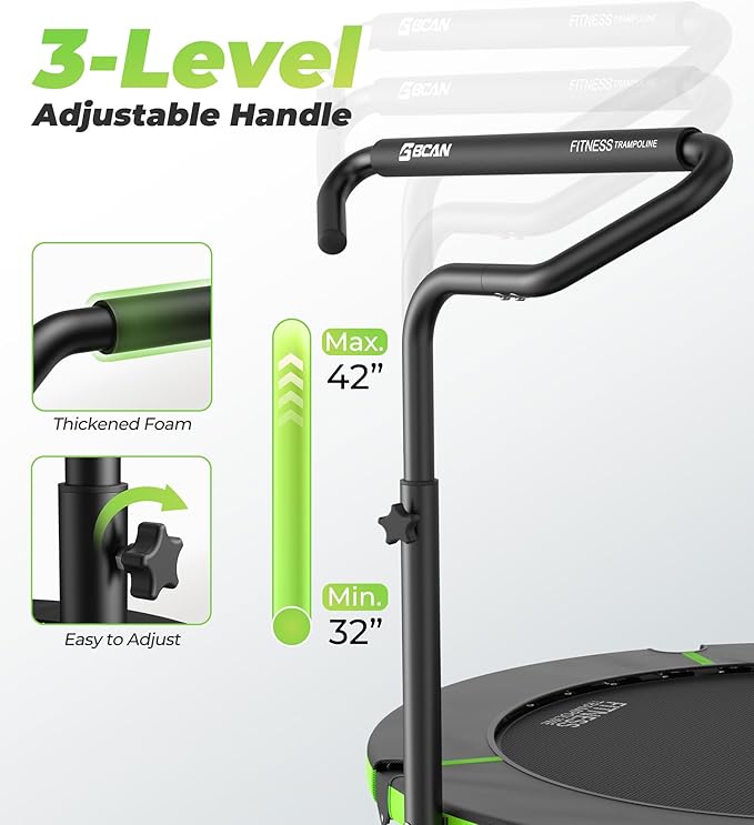 - 3-Level Adjustable Handle: Handle height available from 32'' to 42''. BCAN Rebounder Trampoline for Adults can be adjusted to the height range, ensuring that you can hold the handlebar in the most comfortable position when jumping