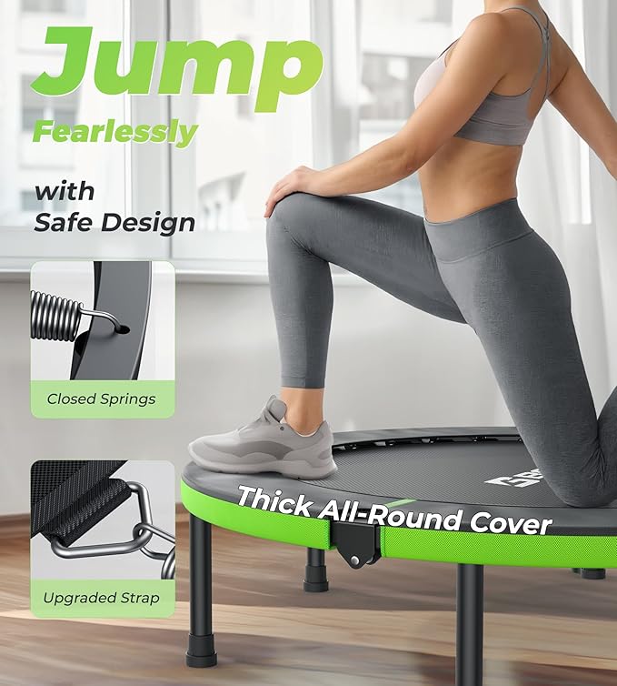 - 330 Lbs High Capacity: 32 high-strength springs, thickened alloy steel, tear-resistant mat make our exercise trampoline supports up to 330 lbs, allowing everyone to join in the fun and fitness journey