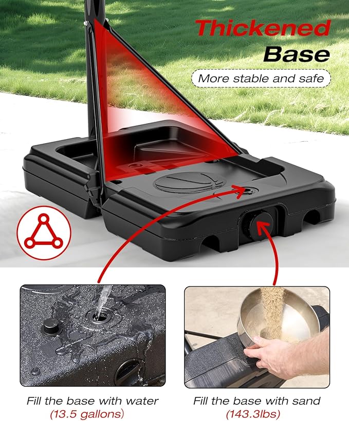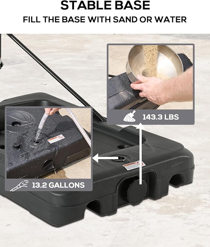 - Sturdy Base for Safety: The outdoor basketball hoop features a robust base that can be filled with 13.2 gallons of water or 143.3 lbs of sand, this portable outdoor basketball goal stays firmly grounded during aggressive dunks and fast-paced gamesβno wobbling or tipping