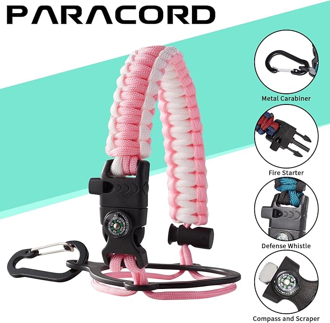 - UNIQUE PARACORD—Perfect Accessories: bright color paracord matches the flask water bottle to give you a youthful vibe while adding a personal style. It comes with a compass, safety loop, metal carabiner, flint, igniter, and whistle to become your survival tool for your wild adventures