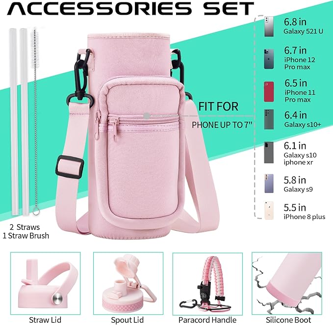 - COMBO—Super Deal: Buy 40oz stainless steel water bottles and get 9 accessories (2 x lids, 1 x survival paracord, 1 x carrying pouch, 1 x shoulder strap, 1 x protective cup mat, 2 x straws, 1 x straw brush). WITH A LIFETIME GUARANTEE, these thermal water bottles are the perfect gift for use at home, work, school, road trips, hiking, sporting events, or just hanging out