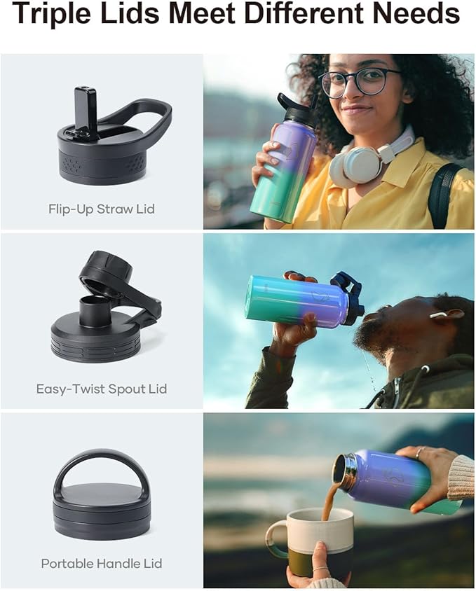 - Super Deal Combo: Buy 32oz insulated water bottle, get 7 accessories. The pack includes 1 x carrying pouch, 3 x lids, 2 x straws, and 1 x straw cleaner. This bottle is ideal for camping, hiking, cycling, running, gym sessions, or outdoor work, ensuring you stay hydrated wherever you go.
