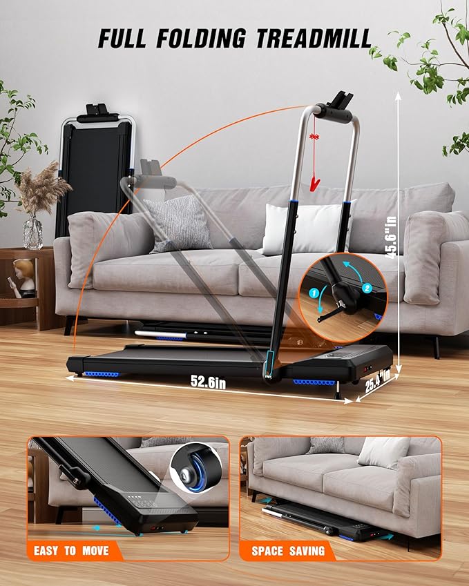 - No Assembly & Space Saving Design: This foldable treadmill arrives assembled and can be used right out of the box, fold it up and walk away in one easy step. The foldable design and built-in transport wheels make it easy to move and store, saving space, suitable for home, apartment and office use