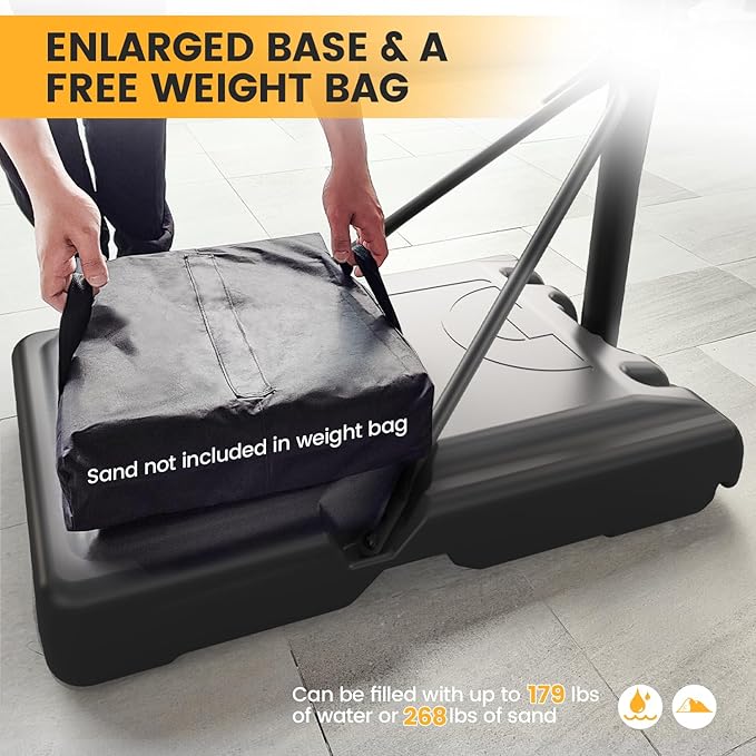 - SANDBAG INCLUDED: Enjoy peace of mind with our additional sandbag, designed specifically for base stability. Also the base could be filled with sand or water to anchor down your basketball system