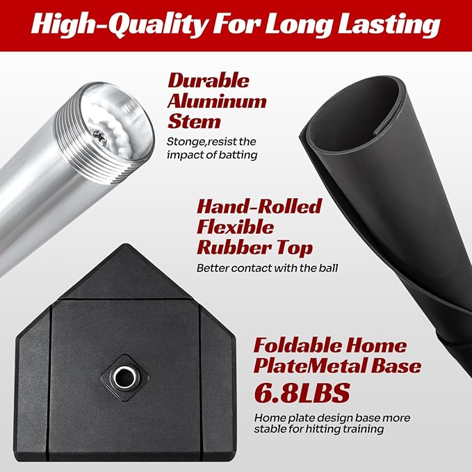 - 【Durable For Long Lasting】 This batting tee is made of industrial grade hand-rolled rubber, aluminum stem and solid metal base for extreme durability and make you better contact the balls,and that will last season after season for teeball, baseball, and softball.