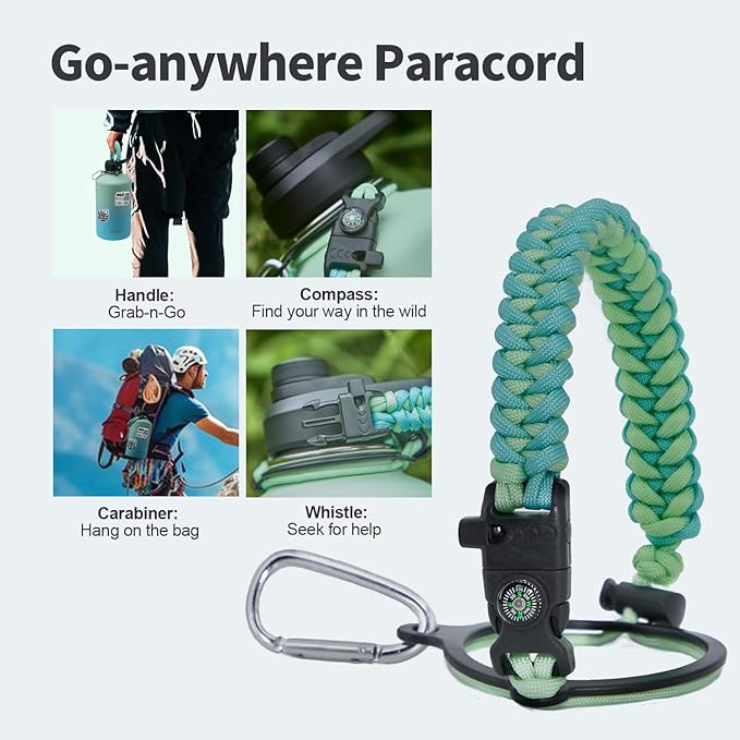 - Palm Fitting Paracord Handle: Compared to handle lids, nylon paracord on the bottle gives you more choices in terms of color coordination and coziness on your hands. Match the handle with your bottle to make a complete outdoorsy look. Compass and carabiner can be lifesavers for hiking and other expeditions