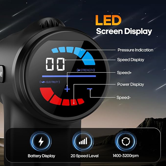 - Precision Comfort Control: The muscle massage gun is easy to operate. It features 20 adjustable speeds. The heated head with three adjustable temperature settings (up to 131Β°F) for targeted and effective relief of muscle pain and tension