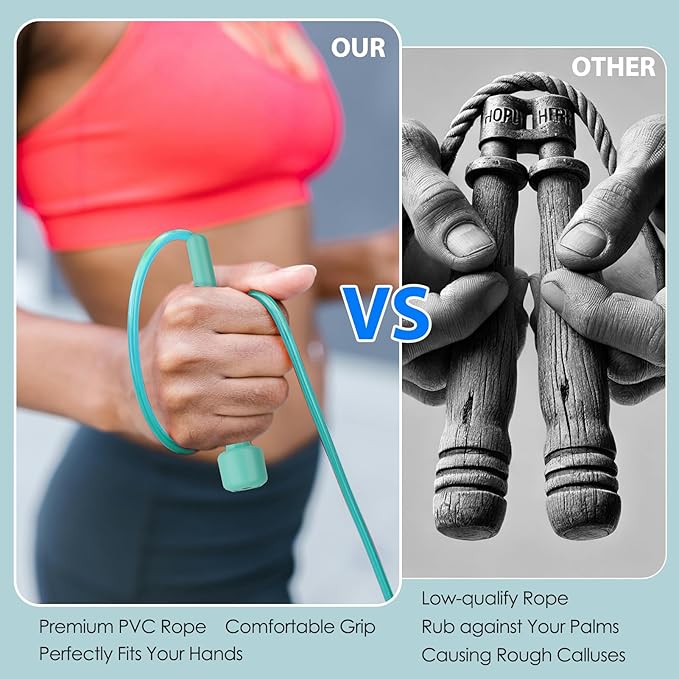 - Ergonomic Handles: Enjoy a perfect grip with our ergonomically designed handles. Crafted for maximum comfort, these handles feature a non-slip, sweat-resistant surface that ensures a secure hold during even the most intense workouts. The thoughtful design keeps your hands dry and comfortable, making every jump smooth and enjoyable.