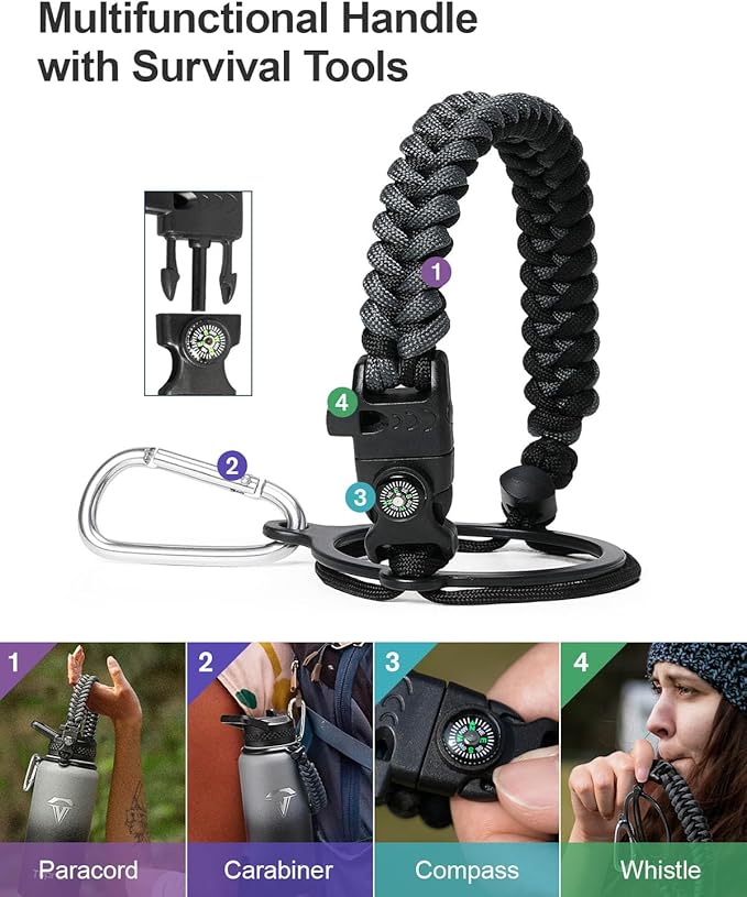 - Ready for adventures: Topre 32oz water bottles include a paracord handle,it is crafted from sturdy braided rope with an attached survival kit. This includes a compass, a whistle, and a clip, making it an ideal companion for any outdoor activity β be it camping,hiking or exploring new places through travelling.