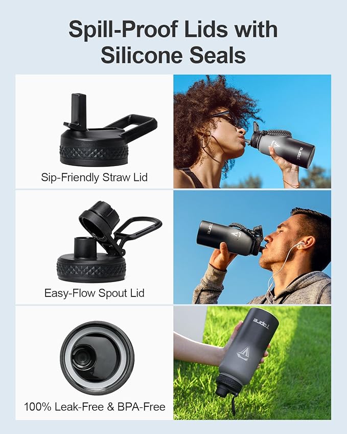 - 100% Leak-Proof: Topre 32oz stainless steel water bottles includes two lidsβa straw lid and a spout lid. Both are equipped with silicone rings to prevent any spills or leaks, and are completely BPA-free for your peace of mind.