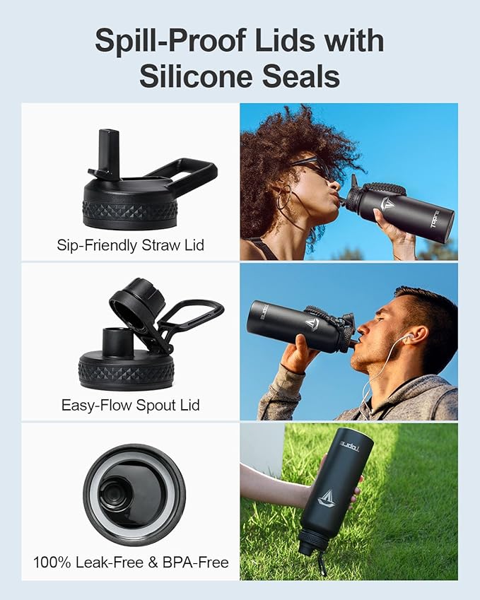 - 100% Leak-Proof: Topre 40 oz stainless steel water bottles includes two lidsβa straw lid and a spout lid. Both are equipped with silicone rings to prevent any spills or leaks, and are completely BPA-free for your peace of mind.