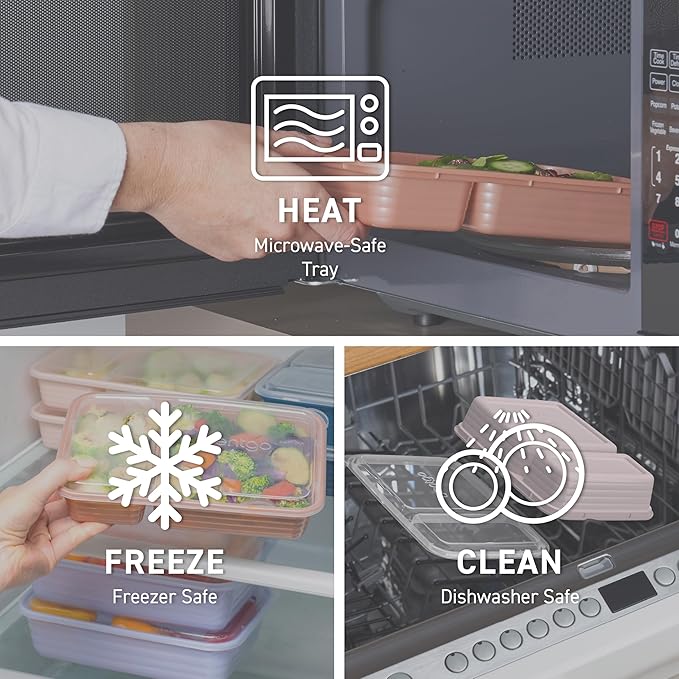 - Easy to Heat & Clean: Safely heat up your food straight from the freezer or refrigerator for warm, delicious meals and leftovers. Each meal prep container is both microwave and top-shelf dishwasher safe. Note: before microwaving, open the lid corner to allow steam to vent. For best results, hand wash to extend the life of the product.