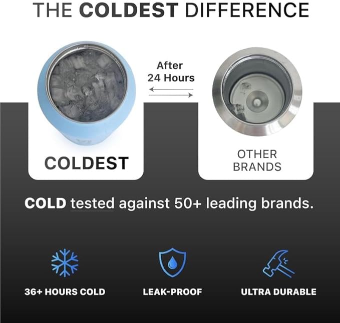 - 𝐀 𝐋𝐄𝐀𝐊-𝐏𝐑𝐎𝐎𝐅 𝐄𝐗𝐏𝐄𝐑𝐈𝐄𝐍𝐂𝐄: Is your water bottle flask creating a wet mess? The Coldest 18/8 Stainless Steel Water Bottle boasts a 100% leak-proof design, ensuring not a drop escapes. Thanks to the wide mouth lid, it provides convenience without compromising on leakage protection. The true double-wall stainless steel construction guarantees a water tight seal, allowing you to confidently embrace a mess-free hydration experience with Coldest Steel Water Bottles.