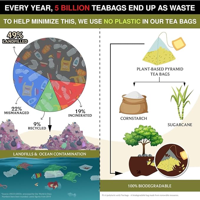 - CONVENIENTLY PACKED - The tea comes packed in pyramid bags that allow for a more fuller and intense brew as it provides ample space for the tea leaves to unfurl and infuse. We have removed individual sachets from our packaging to reduce wastage, instead the pyramid bags are packed inside a resealable pouch that can be conveniently stored or carried as a travel tea.