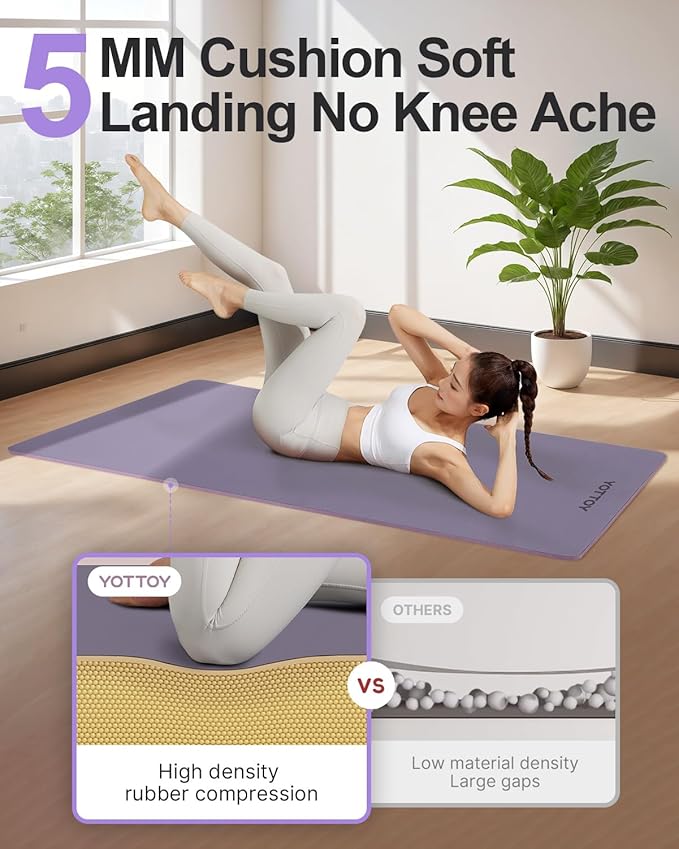- 1.Innovative Upgraded Yoga Mat: Our YOTTOY PU Yoga Mat features a unique coconut shell material offering superior anti-slip performance. Measuring 72" x 26" x 5mm, it provides enhanced elasticity, durability, and tear resistance, making it the perfect choice for intense yoga sessions. The high-density surface ensures excellent rebound, providing a better grip and stability for your practice.