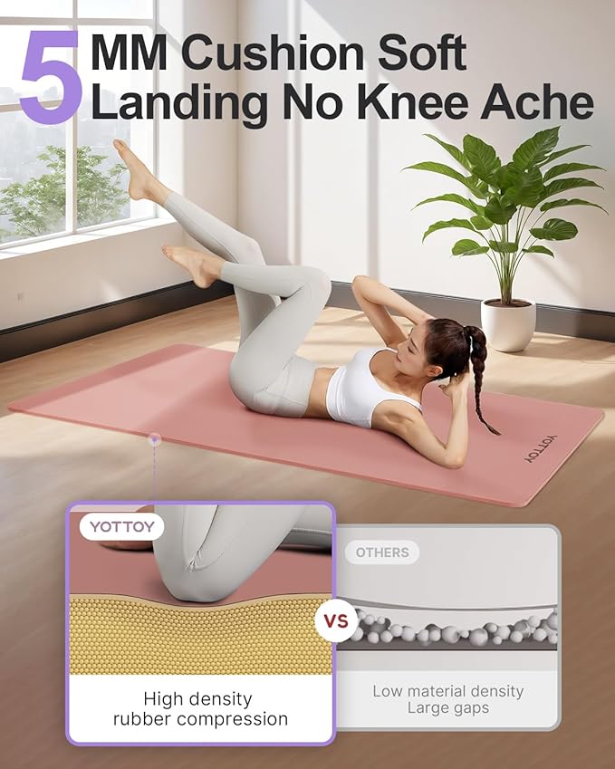 - 1.Innovative Upgraded Yoga Mat: Our YOTTOY PU Yoga Mat features a unique coconut shell material offering superior anti-slip performance. Measuring 72" x 26" x 5mm, it provides enhanced elasticity, durability, and tear resistance, making it the perfect choice for intense yoga sessions. The high-density surface ensures excellent rebound, providing a better grip and stability for your practice.