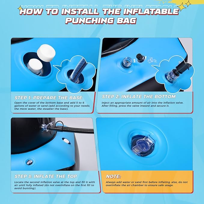 - Easy Setup & Storage: Set up this inflatable punching bag for kids in minutes—just fill the base with water and inflate! The lightweight design of boxing punching bag makes it easy to move and store, ideal for both indoor and outdoor play