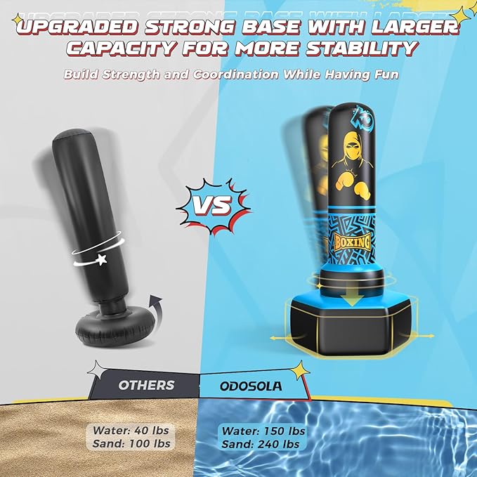 - Stable & Quick Rebound: With an upgraded base that holds up to 240 lbs of sand or 150 lbs of water, this kids punching bag remains stable during play. Its quick rebound ensures it springs back instantly after each hit, keeping kids engaged and active