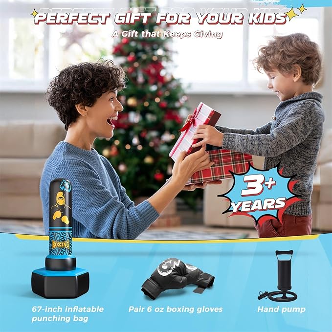 - Perfect Gift for Kids: This 67-inch blue freestanding punching bag comes with boxing gloves and a manual pump. The punching bag set is the ideal birthday or Christmas gift for kids aged 3-12, especially for kids who enjoy martial arts, karate, or taekwondo