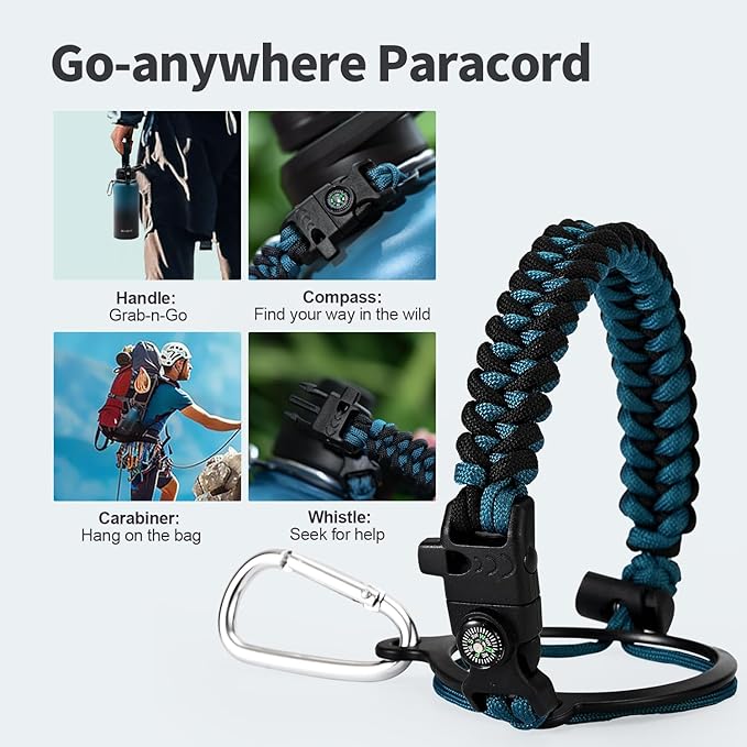 - Palm Fitting Paracord Handle: Compared to handle lids, nylon paracord on the bottle gives you more choices in terms of color coordination and coziness on your hands. Match the handle with your bottle to make a complete outdoorsy look. Compass and carabiner can be lifesavers for hiking and other expeditions