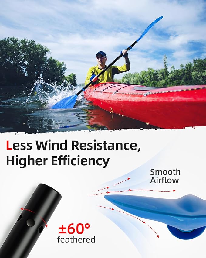 • 【LIGHTWEIGHT AND DURABLE 】The aluminum alloy shaft is known for its strength and ability to withstand the wear and tear of frequent use. In addition to its durability, the aluminum alloy shaft also offers better performance and more efficient paddling. PP blades are lightweight and indestructible blades offer flexibility and efficiency, making it easier for paddlers to navigate through the water with ease.