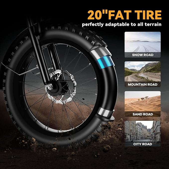 - 𝐒𝐚𝐟𝐞 𝐀𝐧𝐝 𝐂𝐨𝐦𝐟𝐨𝐫𝐭𝐚𝐛𝐥𝐞 𝐑𝐢𝐝𝐢𝐧𝐠: The electric bicycle adopts EABS power-off brake + front and rear double disc brakes for sensitive braking. It is designed with strong off-road performance, reliable braking force and high safety factor. High-strength shock-absorbing front fork and seatpost absorb the bumps of long, rough roads. The 20" fat tires are anti-slip and puncture-proof, ensuring you can ride like roads, snow, beaches, and rugged mountain roads.