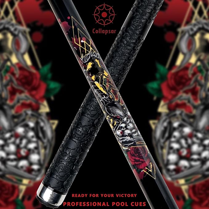 • COLLAPSAR 58" Original Skull Series Pool Cue Stick Come with a 1X1 Cue Case and joint protectors,Available in 19 - 21 ounce .