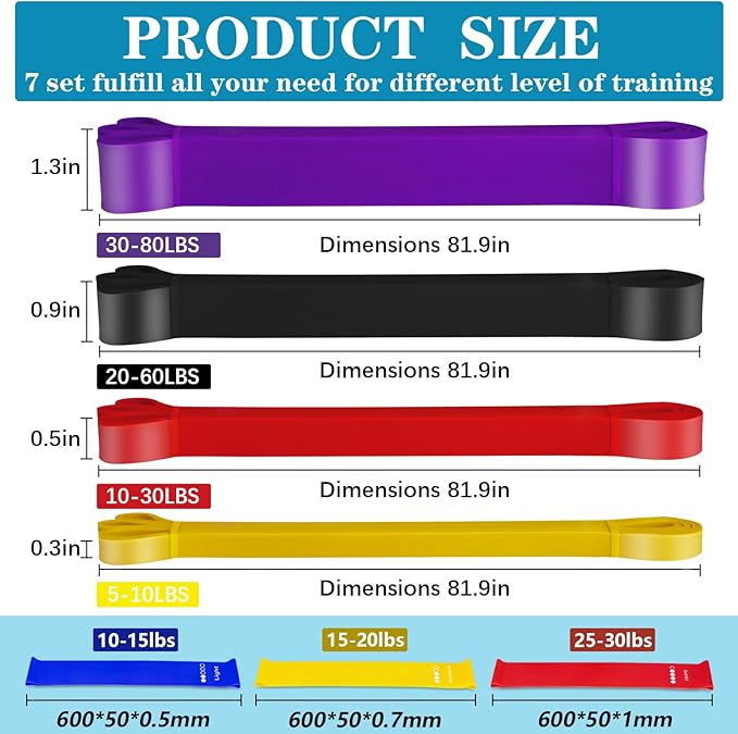 - 【7-Piece Set for Full-Body Toning】This set includes 4 long pull-up assistance bands (Yellow 5-10 lbs, Red 10-30 lbs, Black 20-60 lbs, Purple 30-80 lbs) and 3 resistance loops (Blue 15 lbs, Yellow 20 lbs, Red 30 lbs). Perfectly designed for low-impact yet effective exercises that target arms, abs, glutes, and thighs, helping you achieve a leaner, more toned body
