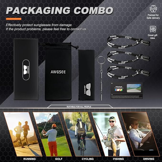 - USE OCCASIONS βΊ AWGSEE polarized sunglasses help reduce glare and provide extra clarity while keeping your eyes protected. Is ideal for usage by motorcycle and cycling, driving, running, fishing, climbing, golf, trekking or other outdoor activity enthusiasts.