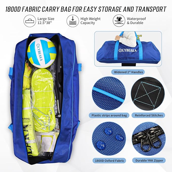 - 𝐀𝐥𝐥 - 𝐈𝐧 - 𝐎𝐧𝐞 𝐏𝐫𝐨 - 𝐆𝐫𝐚𝐝𝐞 𝐀𝐜𝐜𝐞𝐬𝐬𝐨𝐫𝐲 𝐏𝐚𝐜𝐤𝐚𝐠𝐞:This set is your ticket to instant volleyball action. It includes a soft PU volleyball with a large pump (for quick inflation), heavy - duty 12” long (9mm diameter) stakes + 4 guide ropes, high - visibility 60FT boundary lines & scoring marks, and strong climbing carabiners. The 1800D Oxford carry bag (YKK zipper, widened 2” handles) fits all components – even an inflated ball – for easy storage and transport.