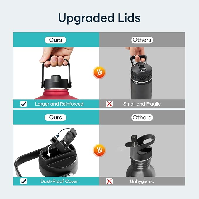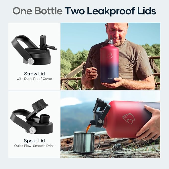 - 2 Caps Pack: This 128 oz stainless steel water bottle comes with straw lid and flex cap, the flex cap is perfect for the beach, camping and hiking, while the straw lid is suitable for cycling and road trip