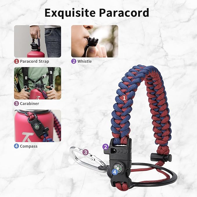- Full-function Paracord Handle: Brilliant paracord of matching colors bring out the bottle with a touch of youthful vibe. Compact compass and handy carabiner make the bottle the ideal survival kit for expeditions in the wild.