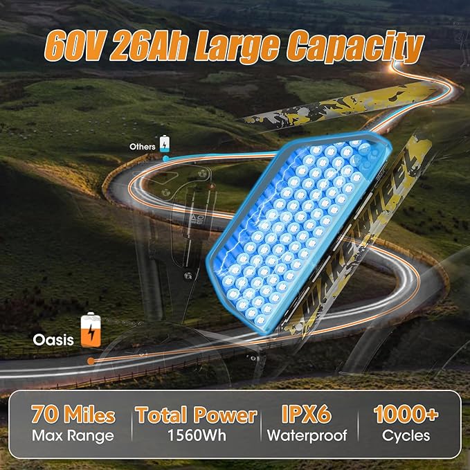 - 60V 26AH High Capacity Battery:Oasis e-bike has higher capacity battery with longer battery life,is capable of traveling longer distances. Lasts up to 40 miles on a single charge on pure electric power and up to 80 miles on pedal assist. TWO CHARGING OPTIONS: you can charge it on the bike or remove the battery to charge it, reducing the risk of theft. IPX6 WATERPROOF, you can ride in rainy weather with confidence. Intelligent BMS keeps the battery safe and power-saving