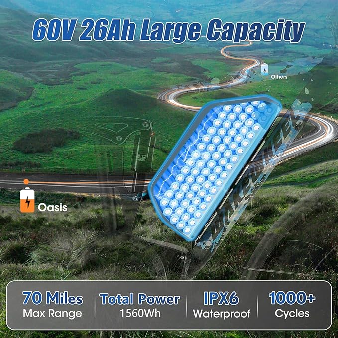 - 60V 26AH High Capacity Battery:Oasis e-bike has higher capacity battery with longer battery life,is capable of traveling longer distances. Lasts up to 40 miles on a single charge on pure electric power and up to 80 miles on pedal assist. TWO CHARGING OPTIONS: you can charge it on the bike or remove the battery to charge it, reducing the risk of theft. IPX6 WATERPROOF, you can ride in rainy weather with confidence. Intelligent BMS keeps the battery safe and power-saving