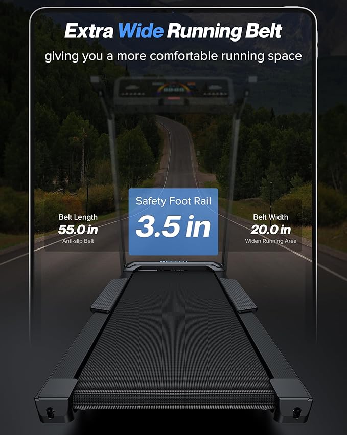 - Ultra Large Running Area: 55" x 20" running belt offers big enough space while you run, fitting all sizes of users' stride lengths. 3.5 inch widen safety foot rails. The treadmill is equipped with 5 layers of non-slip running belt, 8 shock absorbers, deck cushioning protects your knee and joints.