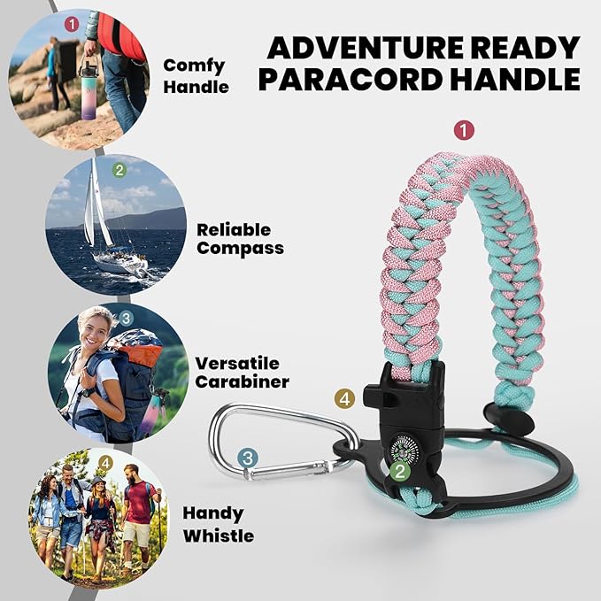 - Iconic Paracord Handle: This insulated water bottle comes with a beautiful hand knit nylon paracord in coordinated color with the water bottle. Configured with a compass and carabiner, this paracord handle is a must-have as a full functional camping / hiking flask