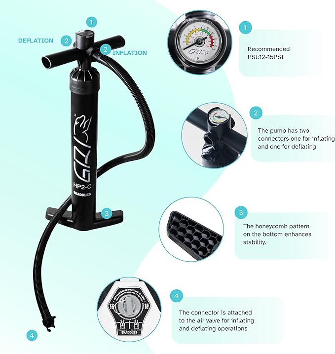 - 【All-in-One SUP Accessories Kit】 Each SKADDLES paddle board comes with a high-efficiency manual air pump, adjustable paddle, ankle safety leash, waterproof phone pouch, repair kit, and removable fins — everything you need for easy setup and worry-free paddling adventures.