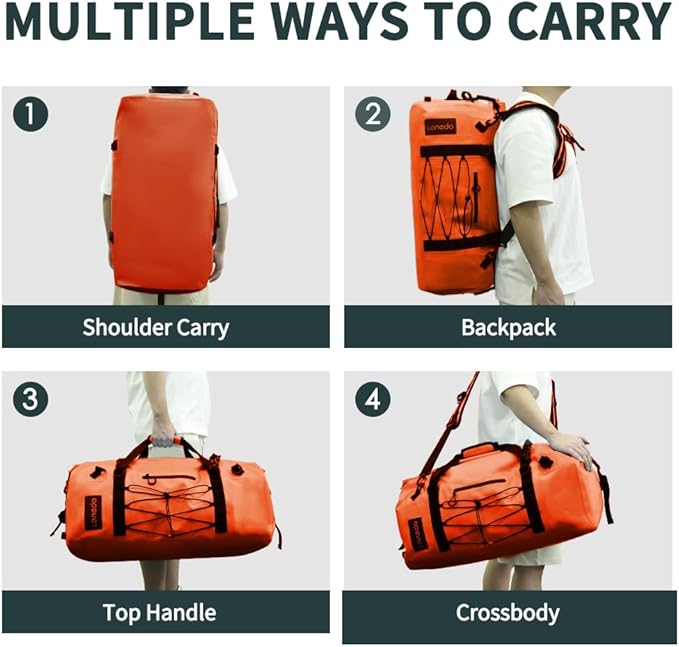 • VARIOUS CARRYING WAY--This large waterproof duffel bag features side straps for easy lifting, a top handle for convenient hand carrying, and adjustable straps for cross-body or shoulder carrying. Enjoy flexible transport options to suit any situation