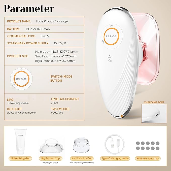 - Multifunctional Design: The electric cellulite machine is equipped with two suction cups, the square suction cup is suitable for large areas such as thighs, abdomen, back, waist, etc., and the round suction cup is suitable for small areas such as arms, when used in facial mode, the suction mode is not used and there is no need to install the suction cup.