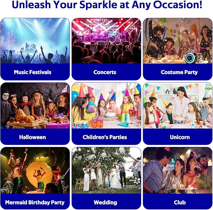 - 【Shine Anywhere You Want】 Apply to your face, body, hair, eyes, lips, nails, collarbones, and more! Great for music festivals, raves, Halloween, themed parties, concerts, weddings, cosplay, and even DIY craft projects.
