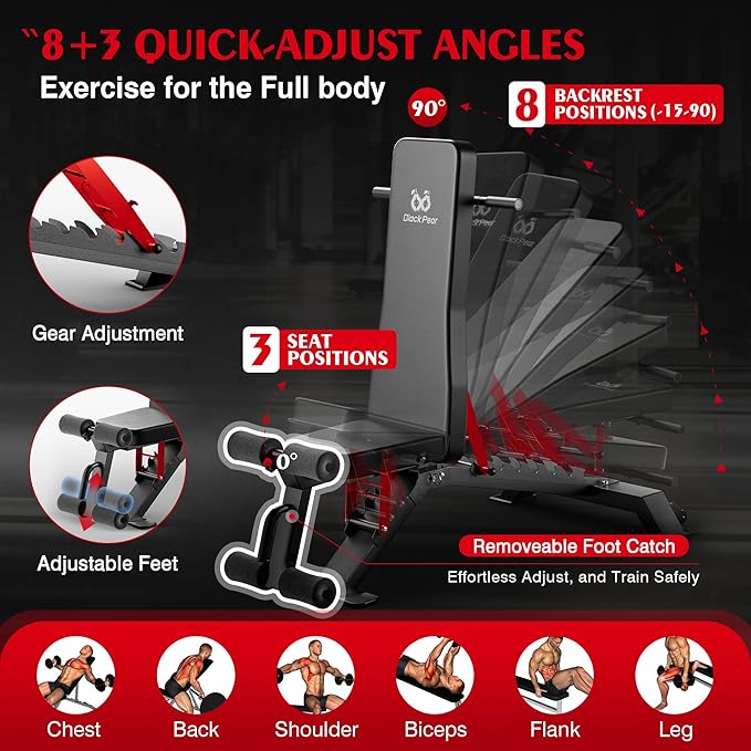 - Compact & Versatile Design: Featuring 8 backrest and 3 seat positions, this bench adapts to your workout needs, offering incline, flat, and decline options up to 90 degrees. The C-shaped lock catch allows for quick and effortless adjustments, making it perfect for strength training, muscle toning, or maintaining your fitness.