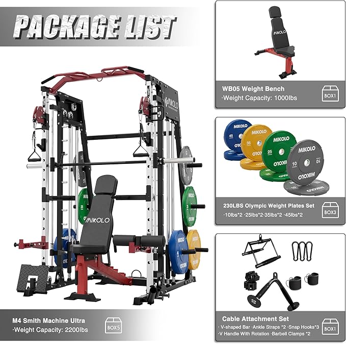 - [Build Your Dream Home Gym] One machine can meet your various needs. M4 is designed for trainers. It is combines power cage, smith machine, cable crossover machine, cable station, and pull-up station. Lets you do unlimited exercises in a limited space! Pre-reserved holes for resistance band, you can do more weight training and resistance exercise. Such as resistance (pull-ups, barbell squats, shoulder presses, cable chest fly, etc.)