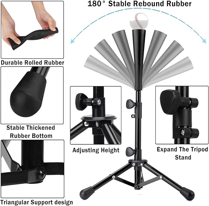 - 【Comes with replacement Rubber Top】In order for customers to use this baseball stand for a long time, we have equipped it with an extra rubber top, so that you will not stop practicing due to the rubber top being damaged. In addition, Rubber tubes Universal design fits most baseball, softball,and T ball batting tees.
