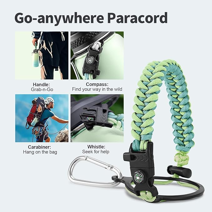 - Palm Fitting Paracord Handle: Compared to handle lids, nylon paracord on the bottle gives you more choices in terms of color coordination and coziness on your hands. Match the handle with your bottle to make a complete outdoorsy look. Compass and carabiner can be lifesavers for hiking and other expeditions