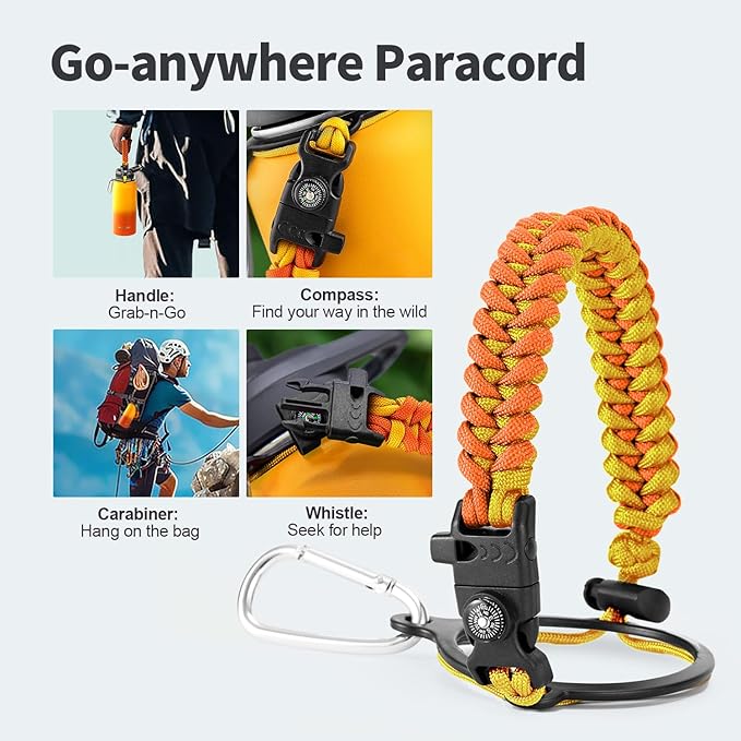 - Palm Fitting Paracord Handle: Compared to handle lids, nylon paracord on the bottle gives you more choices in terms of color coordination and coziness on your hands. Match the handle with your bottle to make a complete outdoorsy look. Compass and carabiner can be lifesavers for hiking and other expeditions