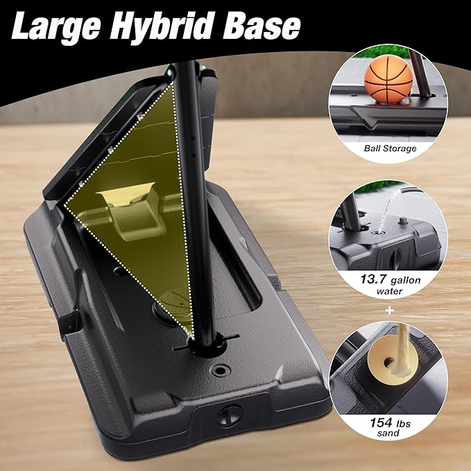 - Rock-Solid Stability: Engineered for stability, our basketball goal outdoor features a massive 44” x 28” base (filled with 13.7 gallons water or 154 lbs sand). Its triangular support structure with guard plate withstands any weather, eliminating tipping risks. Play confidently, no matter the game intensity