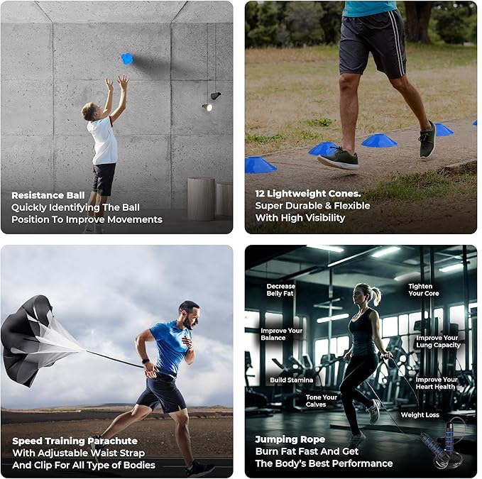 • "Agility Training Equipment Kit": Includes a 2 * 20ft agility ladders with 8 ground stakes, 4 adjustable agility hurdles, 12 vibrant yellow disc cones, and a high-resistance running parachute. Perfect for all skill levels—from beginners to pros—this set is built to elevate your speed, coordination, and overall athletic performance.
