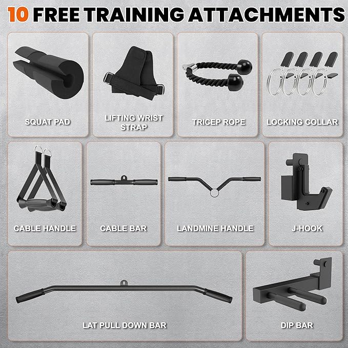 - Complete Strength Package: Includes 18 professional attachments: Multi-grip, 2 Sandwich j-cup, dip bars, safety bar, 2 handles, lat pulldown pedal, 360° landmine, 2 Olympic barbell holders, 4-post plate storage, dual cable bars, landmine pivot, lat bar, cable bar, T bar, 6 band pegs, clip, tricep rope, squat pad and lifting grips.